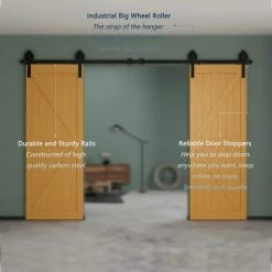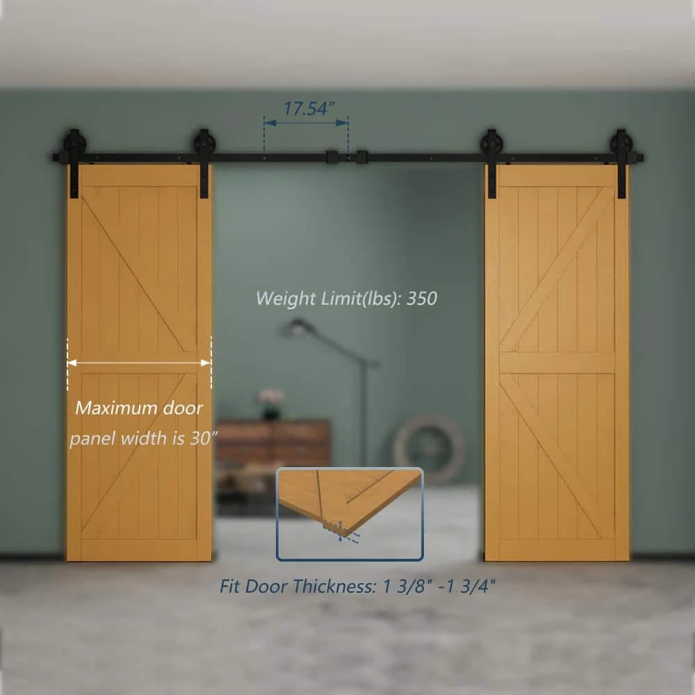 - Pre-install notice: only the hardware is for sale, doors are not included the hardware package has lag bolts for wooden wall/drywall/concrete wall our sliding barn door hardware kit is compatible with door thickness from 1-3/8 in. to 1-3/4 in. if you have a door trim, you would better put a header board that is as thick as the trim and then attach the rail to the header board you need to have at least 8 in. of space between the top of the door to the ceiling to accommodate the hardware we use 2 hangers to hold 1 door, for a single door kit, there will be 2 hangers in the package for a double door kit, there will be 4 hangers, if you have a door that is either too wide or too heavy, then you can purchase additional hangers for that door