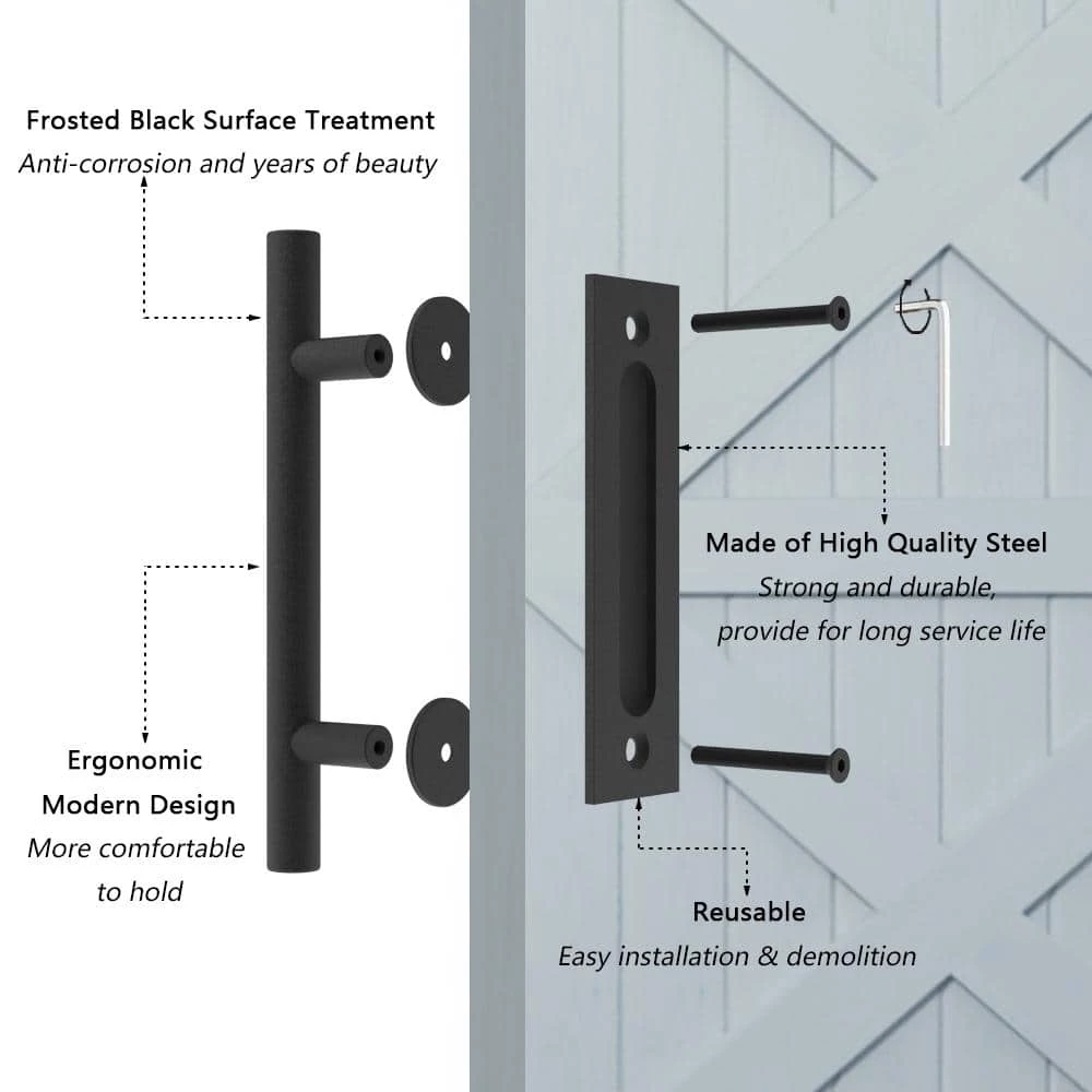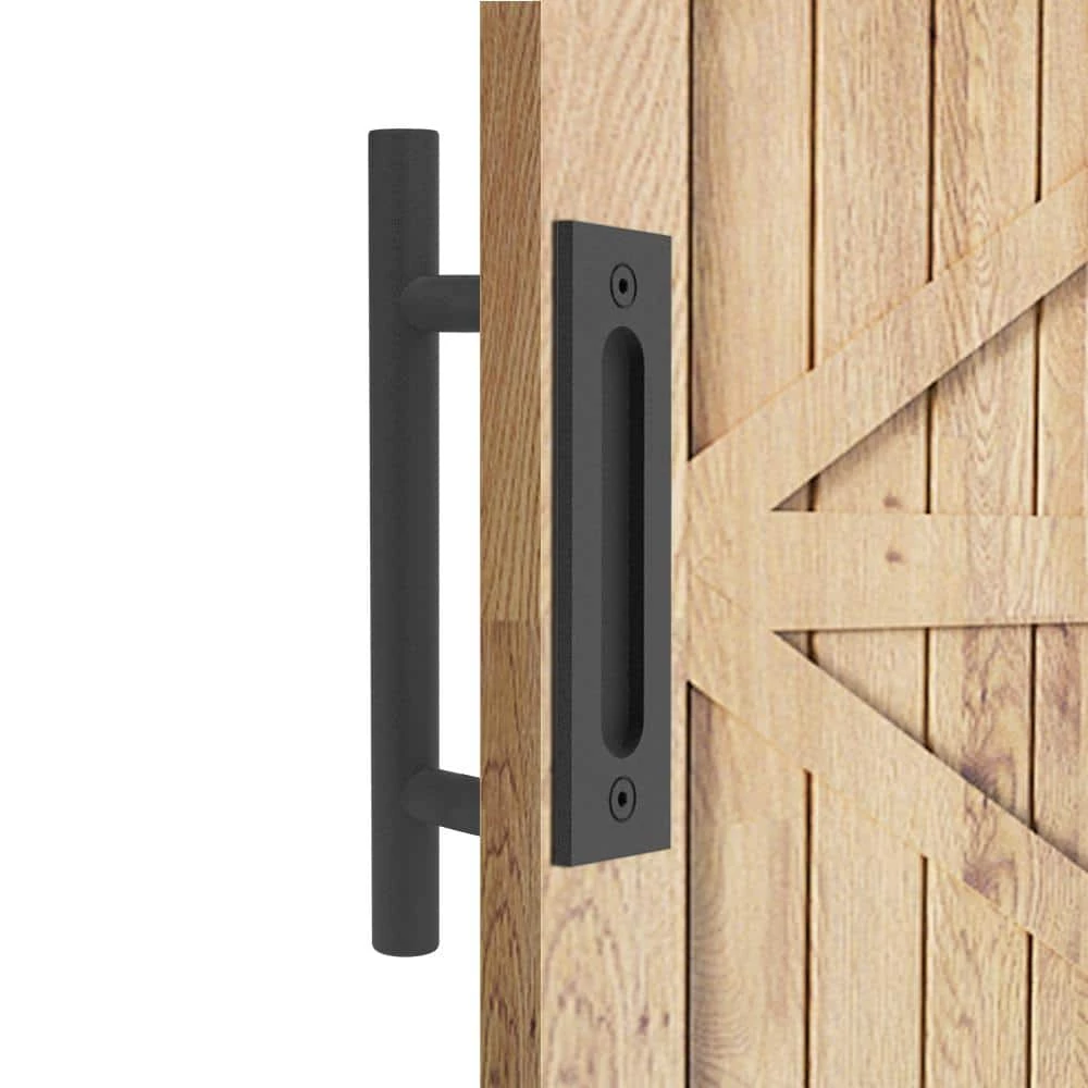 - Set handle on 2-sides of the door, inside flush pull and outside pulls handle, a perfect application for the sliding barn door