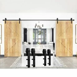 - Pre-install notice: only the hardware is for sale, doors are not included, the hardware package has lag bolts for wooden wall/drywall/concrete wall, our sliding barn door hardware kit is compatible with door thickness from 1-3/8 in. to 1-3/4 in., if you have a door trim, you would better put a header board that is as thick as the trim and then attach the rail to the header board, you need to have at least 5 in. of space between the top of the door to the ceiling to accommodate the hardware, we use 2 hangers to hold 1 door, for a single door kit, there will be 2 hangers in the package, for a double door kit, there will be 4 hangers, if you have a door that is either too wide or too heavy, then you can purchase additional hangers for that door