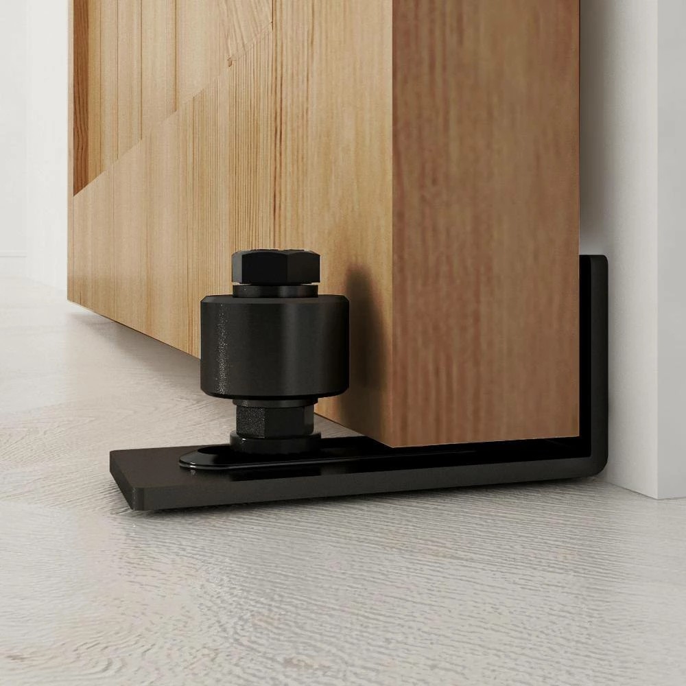 - Floor guide: fit door panel thickness: 7/8 in. to 2-1/8 in., adjust the 2 rollers to fit the door panel and then tighten the screw in the bottom of the floor guide so that the rollers will be fixed in the workable position