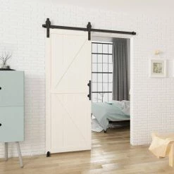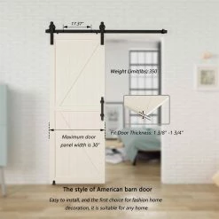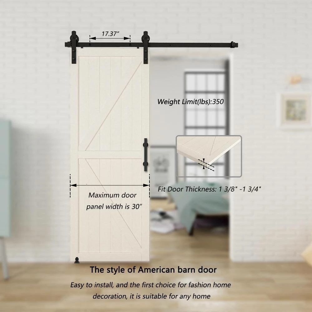- Pre-install notice: only the hardware is for sale, doors are not included, the hardware package has lag bolts for wooden wall/drywall/concrete wall, our sliding barn door hardware kit is compatible with door thickness from 1-3/8 in. to 1-3/4 in., if you have a door trim, you would better put a header board that is as thick as the trim and then attach the rail to the header board, you need to have at least 5 in. of space between the top of the door to the ceiling to accommodate the hardware, we use 2 hangers to hold 1 door, for a single door kit, there will be 2 hangers in the package, for a double door kit, there will be 4 hangers, if you have a door that is either too wide or too heavy, then you can purchase additional hangers for that door