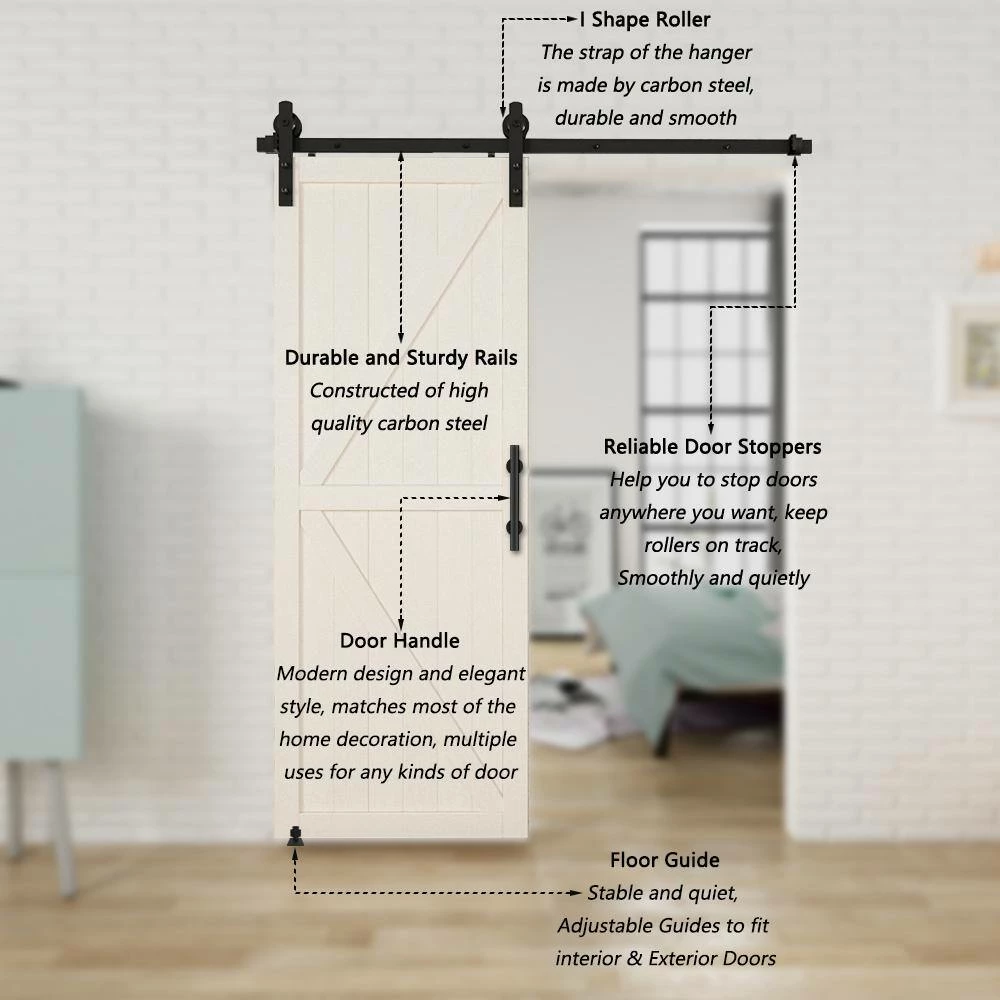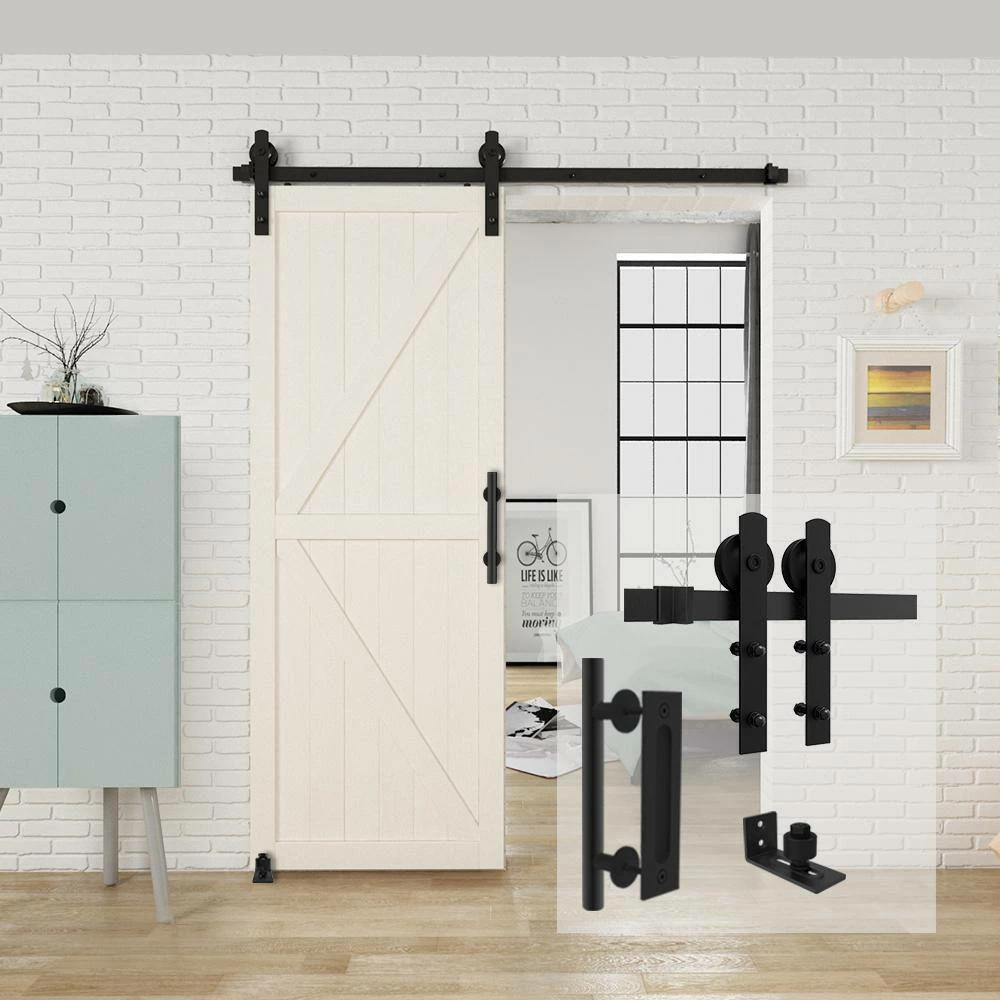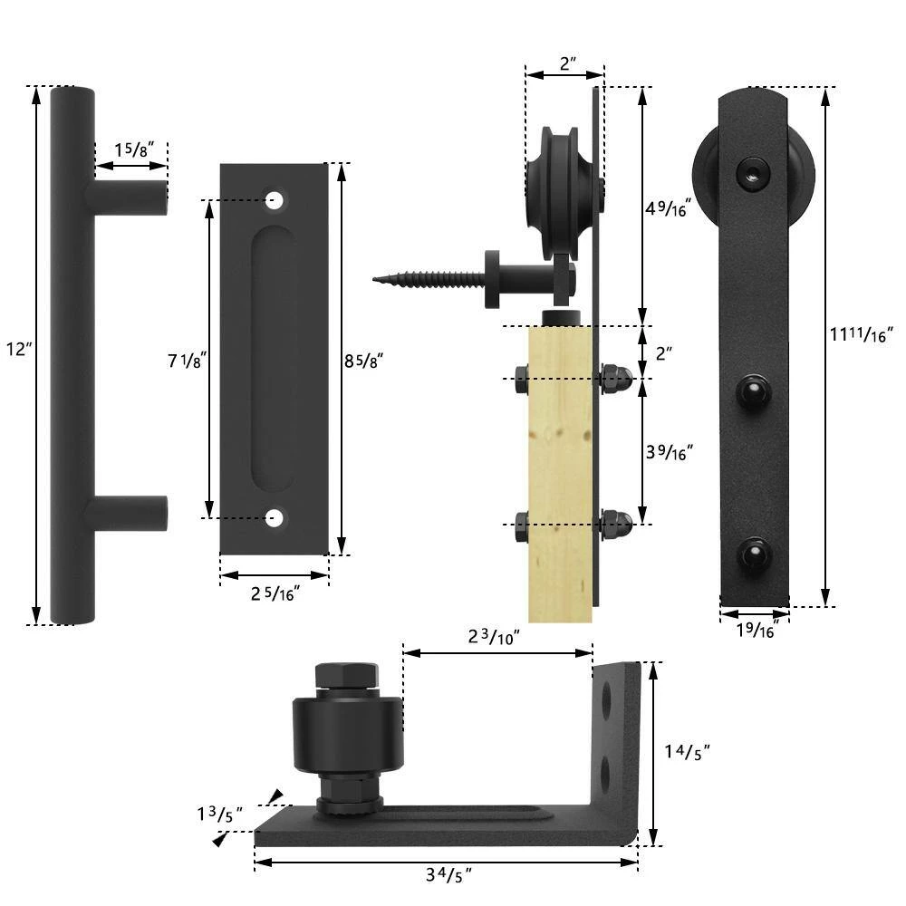 - Package included: barn door hardware kit (1 x 5 ft. rails, 2 x hanger, 4 x rail spacer, 1 x 12 in. cylinder pull handle set, 1 x single roller floor guide, 1 x T-shaped floor guide, 2 x door stop, 2 x end cap, 1 x hex key) all assembly hardware is included as you see in the pictures, door not included
