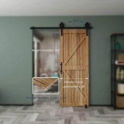- Pre-install notice: only the hardware is for sale, doors are not included, the hardware package has lag bolts for wooden wall, our sliding barn door hardware kit is compatible with door thickness from 1-3/8 in. to 1-3/4 in. if you have a door trim, you would better put a header board that is as thick as the trim and then attach the rail to the header board, you need to have at least 8 in. of space between the top of the door to the ceiling to accommodate the hardware, we use two hangers to hold one door, for a single door kit, there will be two hangers in the package, for a double door kit, there will be four hangers, if you have a door that is either too wide or too heavy, then you can purchase additional hangers for that door