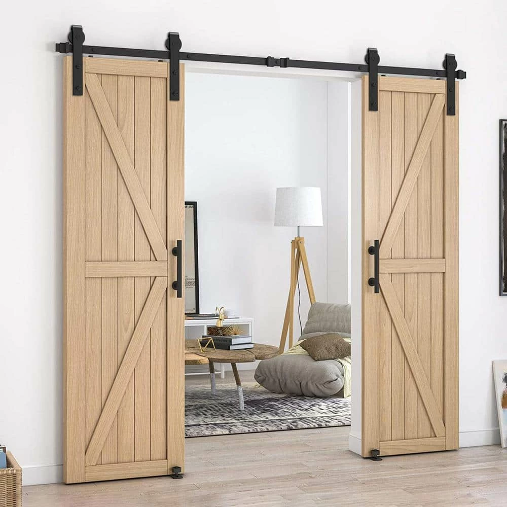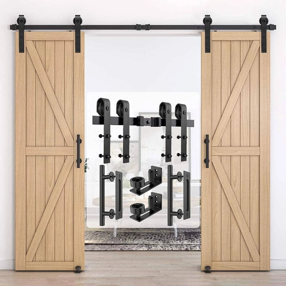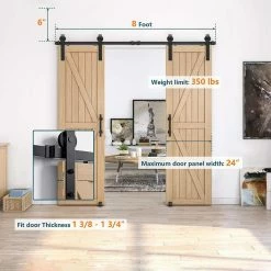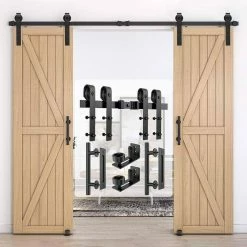 - Pre-install notice: only the hardware is for sale, doors are not included, the hardware package has lag bolts for wooden wall/drywall/concrete wall, our sliding barn door hardware kit is compatible with door thickness from 1-3/8 in. to 1-3/4 in., if you have a door trim, you would better put a header board that is as thick as the trim and then attach the rail to the header board, you need to have at least 5 in. of space between the top of the door to the ceiling to accommodate the hardware, we use 2 hangers to hold 1 door, for a single door kit, there will be 2 hangers in the package, for a double door kit, there will be 4 hangers, if you have a door that is either too wide or too heavy, then you can purchase additional hangers for that door