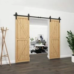 - Pre-install notice: only the hardware is for sale, doors are not included, the hardware package has lag bolts for wooden wall/drywall/concrete wall, our sliding barn door hardware kit is compatible with door thickness from 1-3/8 in. to 1-3/4 in. if you have a door trim, you would better put a header board that is as thick as the trim and then attach the rail to the header board, you need to have at least 5 in. of space between the top of the door to the ceiling to accommodate the hardware, we use 2 hangers to hold 1 door, for a single door kit, there will be 2 hangers in the package, for a double door kit, there will be 4 hangers, if you have a door that is either too wide or too heavy, then you can purchase additional hangers for that door
