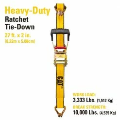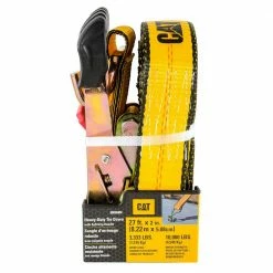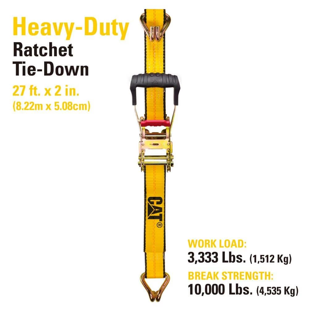 This strap features a 27 foot long x 2 inch wide strap with 3,333 pound working strength/10,000 pound breaking strength with a double J-hook. Heavy duty, designed and built to perform in the most demanding tasks and conditions. Not only do they look good but these straps offer strength, performance and convenience. All of our tie downs feature premium materials and construction to deliver construction to deliver consistent performance. Cat straps are there for when you need them, purpose-built for a wide range of applications at work, at play and everywhere in between.