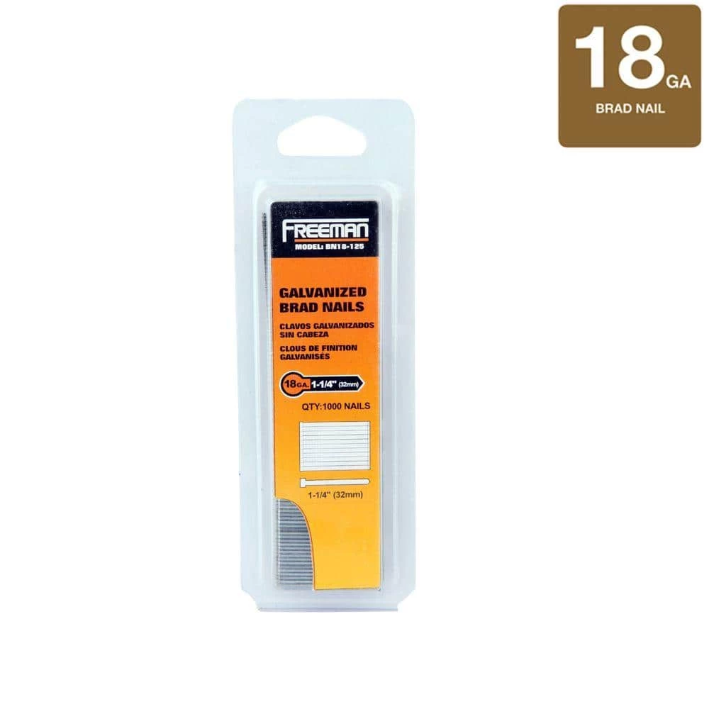Freeman’s 1-1/4 in. 18-Gauge Brad Nails are an excellent choice for fastening thicker trim, moldings and base boards. These smaller headed finishing nails offer excellent strength with minimal visibility. Fits most 18-Gauge pneumatic brad mailers capable of handling 1.25 in. nails.