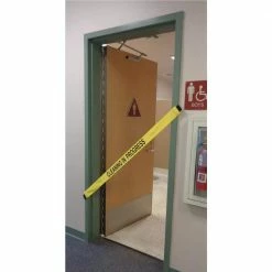 The Magnetic Door Barrier is a banner style door barricade by UtiliMate, LLC. All of our products are fabricated with durable rot-resistant nylon materials and exceptionally strong magnetic ends. The door barricade comes with a built-in magnetic device on each end of the unit. Simply attach these magnetic ends to the metal frames of an opened doorway to prevent patrons from walking into a room, it’s very effective and easy to use. When finished simply pull the door barricades black tabs towards you until the unit detaches itself from the metal framed doorway. Roll up the space saving safety sign and store it your tool box or push cart. The door barricade is lightweight and very simple to use, it’s one of those straightforward products that just works.