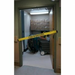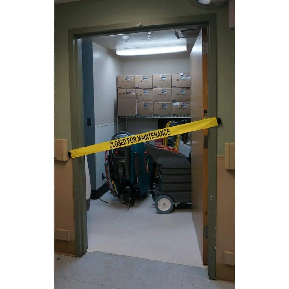 The Magnetic Door Barrier is a banner style door barricade by UtiliMate, LLC. All of our products are fabricated with durable rot-resistant nylon materials and exceptionally strong magnetic ends. The door barricade comes with a built-in magnetic device on each end of the unit. Simply attach these magnetic ends to the metal frames of an opened doorway to prevent patrons from walking into a room, it’s very effective and easy to use. When finished simply pull the door barricades black tabs towards you until the unit detaches itself from the metal framed doorway. Roll up the space saving safety sign and store it your tool box or push cart. The door barricade is lightweight and very simple to use, it’s one of those straightforward products that just works.