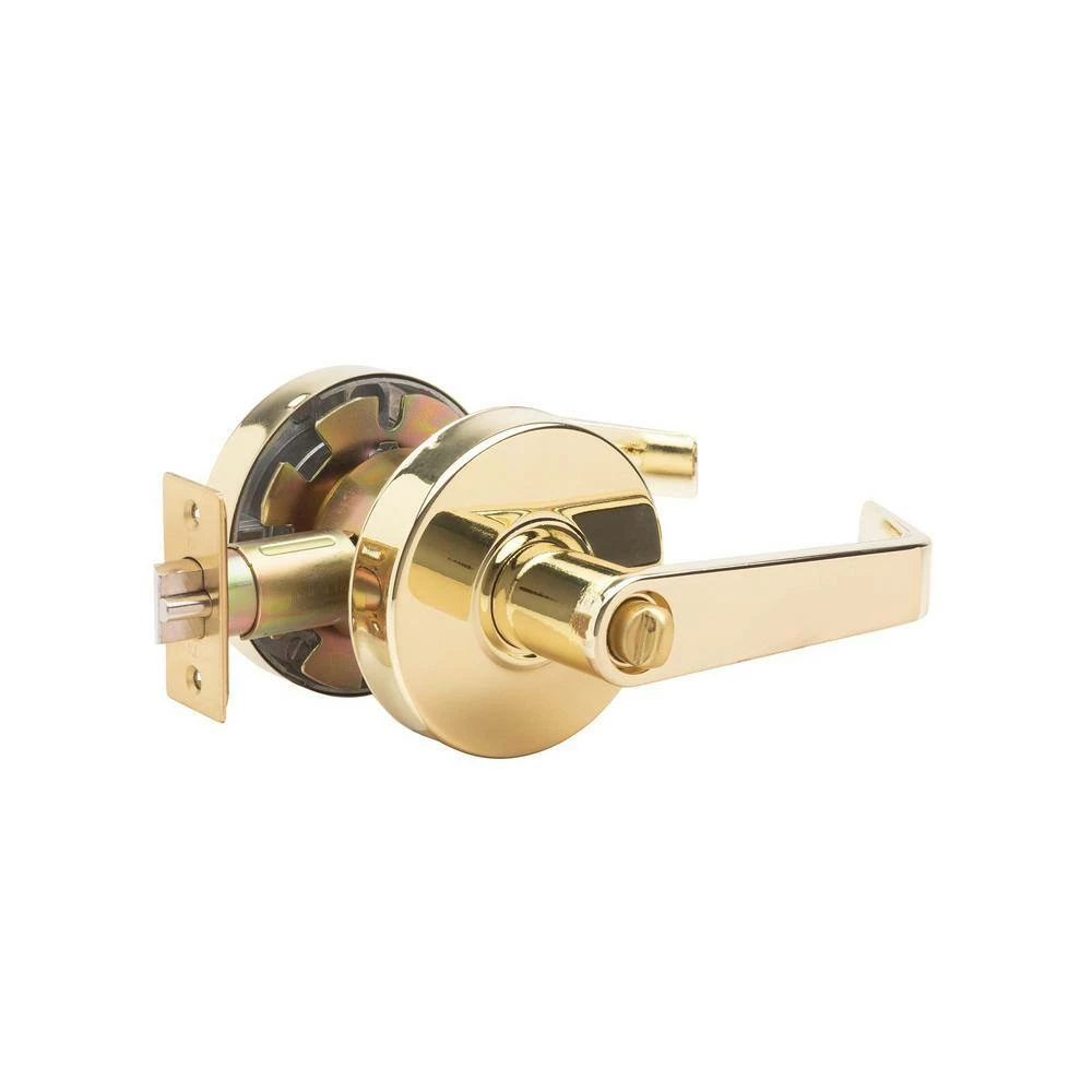 The Trans-Atlantic (TACO) LSV Saturn cylindrical entry leverset comes in a bright brass finish and includes an ANSI strike. This entry door handle has a push button on the interior and a key for the exterior side of the lever, allowing you to leave quickly and re-enter easily. This leverset is ADA compliant and exceeds ANSI standards for Grade 2, making it the perfect fit for commercial, standard duty applications.